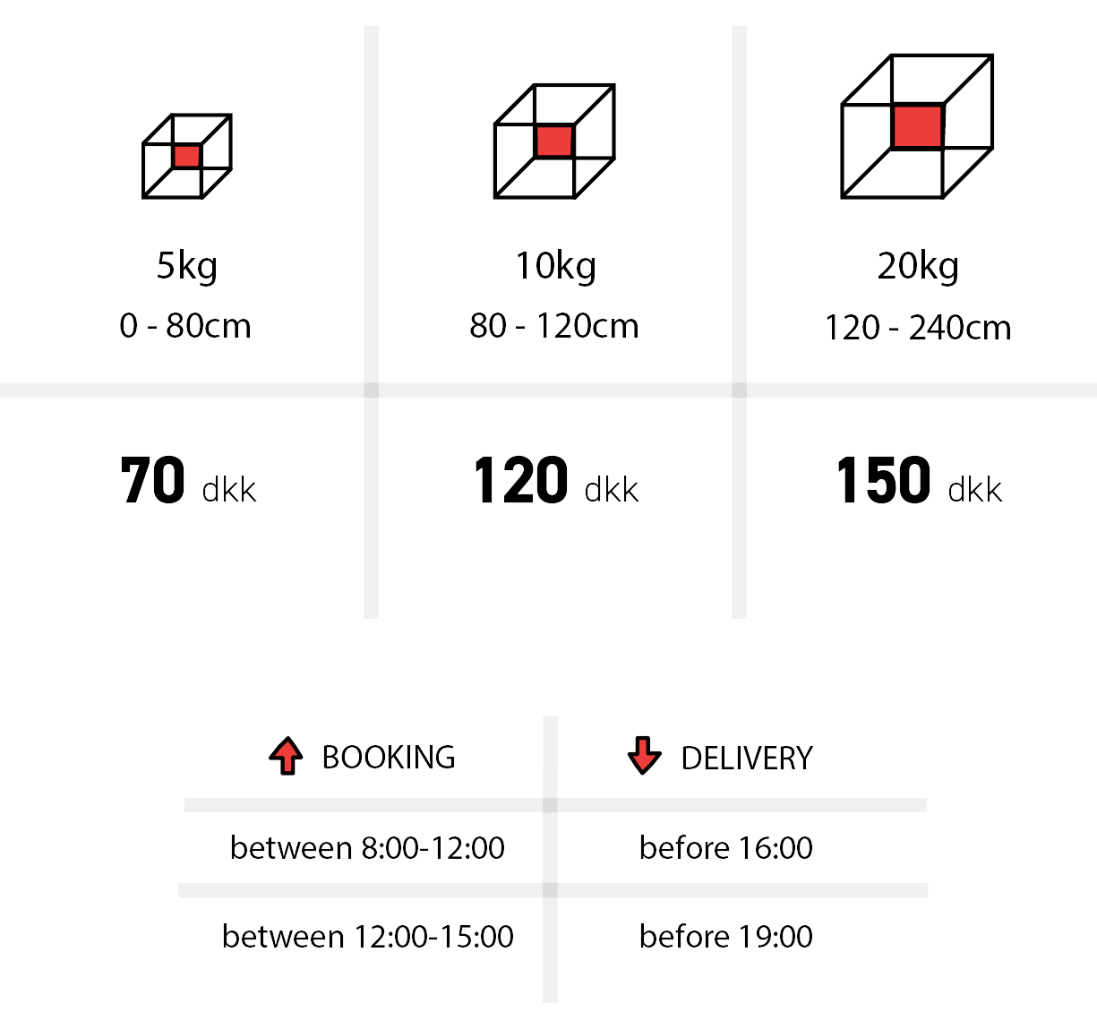 8 kr per minute waiting time if more than five minutes upon pickup/delivery